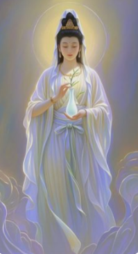 In my meditation, Guanyin Buddha appeared in a white robe that’s the same as many statues depicted and holding a water bottle standing on top of a white cloud.  There was a big Sun in orange colour in the background.
